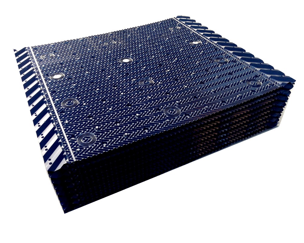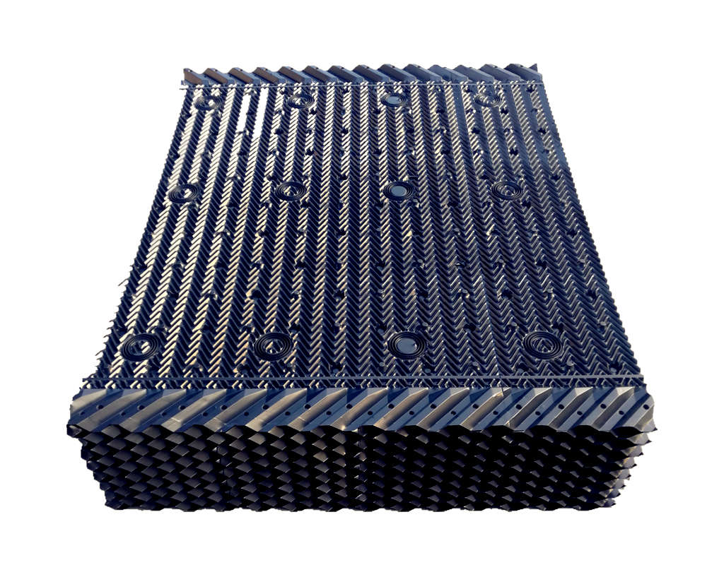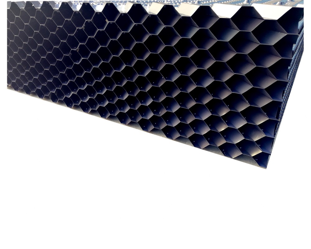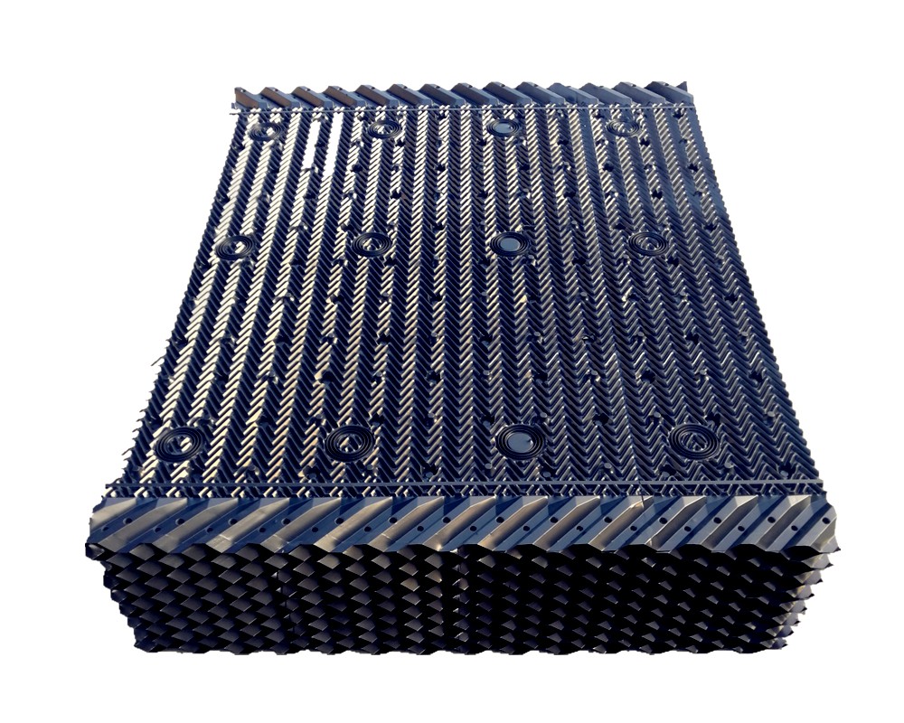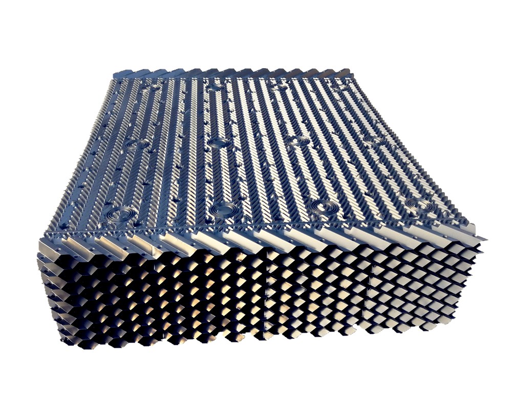冷卻塔塔芯填料是由優(yōu)質(zhì)PVC聚乙烯片正負(fù)壓及吸塑而成,主要采用了水紋波形、梯形波、點(diǎn)波形、S波型、人字波形填料,散熱面積增長(zhǎng)系數(shù)大,水流在板面上分布性能好,水和空氣流經(jīng)板面時(shí)擾動(dòng)大等優(yōu)點(diǎn)。填料不易變形,耐高溫,抗老化,且阻燃性能好,風(fēng)阻系數(shù)小。安裝方便,易清洗,運(yùn)輸方便該散熱填料采用粘接式及懸掛式,安裝簡(jiǎn)便,便于清洗,且成功解決了粘接填料因吸積垢、自重而產(chǎn)生變形,且變形后積垢更加嚴(yán)重、難于清洗的問題。填料阻燃性能好,阻燃氧指數(shù)指標(biāo)為42.7,每立方米組裝體質(zhì)量約為15 kg—30kg/m3,組裝高度為0.5m—3.0m,交錯(cuò)布置,對(duì)于塔壁周邊異形塊可視現(xiàn)場(chǎng)布置情況,按實(shí)際尺寸切割、安裝。