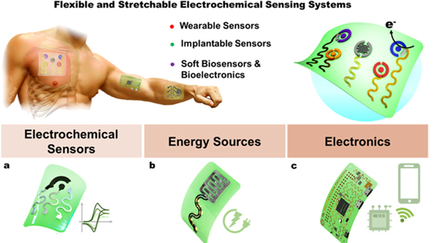 通過柔性生物傳感器可連續(xù)獲取溫度、壓力、應(yīng)力等物理信號來實現(xiàn)對人體活動情況,如心率、血壓、腦電圖、心電圖等,但連續(xù)監(jiān)測人體體液、呼出氣中的各類化學(xué)物質(zhì)的可穿戴傳感器仍面臨許多問題,比如傳感器的柔韌性、靈敏度、準(zhǔn)確性以及與人體皮膚的貼合性等。