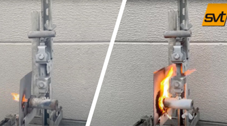 大連義邦引入SVT輕薄型膨脹防火涂料,是一種特制的防火涂層,涂敷于動力電池包的內壁或殼體上,用于電池包內部以及外部的火燒保護,當暴露在1200?C 的明火條件下,瞬間膨脹超過自身厚度25倍以上,僅使用1毫米厚并且是1層的SVT涂層,即可將面板未暴露面(背面)的溫度保持并穩定在150 ?C以內,并且滿足國內行業需求滿足30分鐘的防火要求。并且,火燒后產生的膨脹層依然保持高絕緣性能。